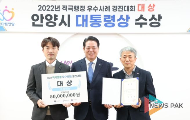 뉴스팍 진금하 기자 | 안양천 수질관리를 위해 인근 5개 도시의 협력을 이끌어낸 안양시가 행정안전부, 인사혁신처, 국무조정실이 공동 주관하는 ‘2022년 적극행정 우수사례 경진대회’에서 대상을 수상했다.