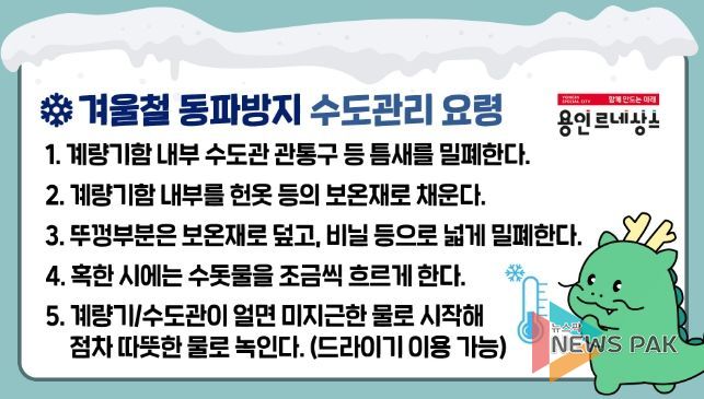 용인특례시는 11월 30일부터 내년 3월 31일까지 '겨울철 한파 대비 수도시설 동파 방지대책'을 추진한다.