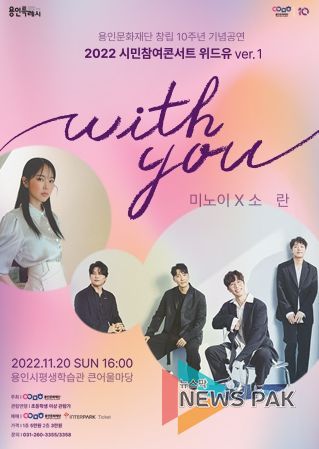 뉴스팍 진금하 기자 | (재)용인문화재단은 창립 10주년 기념 콘서트 'with you'를 오는 12월 17일 오후 7시 용인시평생학습관 큰어울마당에서 진행한다.