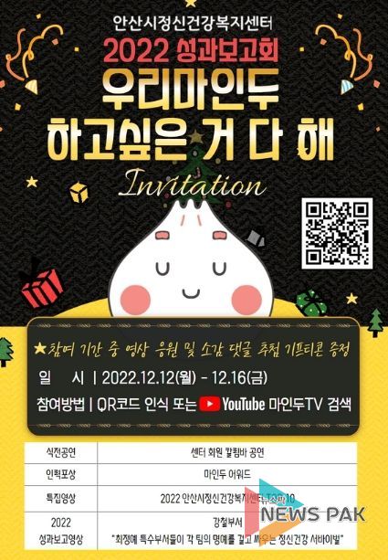 뉴스팍 진금하 기자 | 안산시 정신건강복지센터는 2022년 사업성과보고회 ‘우리 마인두 하고 싶은 거 다 해’ 행사를 이달 12~16일까지 안산시정신건강복지센터 유튜브 채널 ‘마인두TV’로 개최한다고 12일 밝혔다.