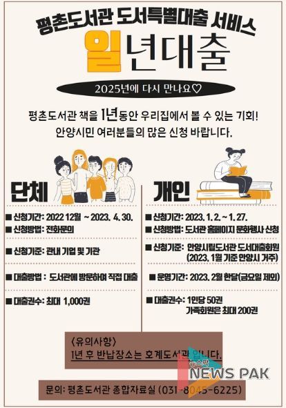 뉴스팍 진금하 기자 | 안양시 평촌도서관이 재건축으로 인한 임시휴관 기간 중 독서 생활을 이어갈 수 있도록 중단없는 대출서비스 ‘일년대출’을 운영한다고 밝혔다.