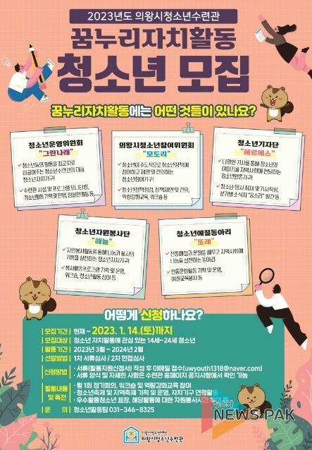 뉴스팍 진금하 기자 | 의왕시청소년수련관에서 2023년도 꿈누리자치활동에 참여할 의왕시 관내 거주 혹은 재학 중인 14세~24세 청소년을 모집한다.