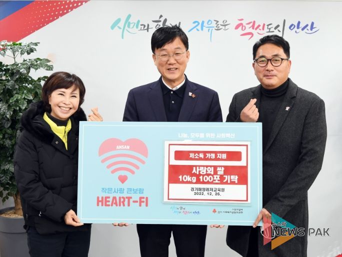 뉴스팍 진금하 기자 | 안산시는 지난 26일 경기해양레저교육원으로부터 연말 이웃돕기를 위한 쌀 100포(10kg)를 기탁받았다고 27일 밝혔다.