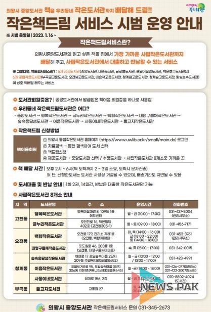 뉴스팍 진금하 기자 | 의왕시가 1월 16일부터 중앙도서관의 책을 사립작은도서관까지 배달해주는 ‘작은책드림서비스’를 시범 운영한다고 밝혔다.