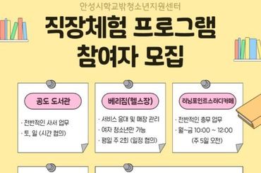 안성시 꿈드림, 학교 밖 청소년 직장체험 프로그램 참여자 모집