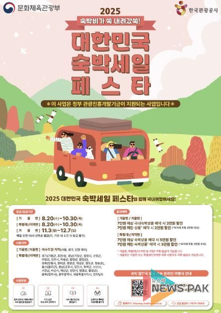 뉴스팍 배상미 기자 | 가평군이 문화체육관광부‧한국관광공사가 주관하는 ‘2025 하반기 대한민국 숙박세일 페스타’에 참여해 관광객들에게 대폭적인 숙박 할인 혜택을 제공한다.