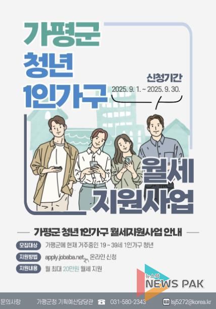 뉴스팍 배상미 기자 | 가평군이 관내 청년들의 주거비 부담을 덜어주기 위해 3분기 ‘청년 1인 가구 월세 지원사업’을 추진한다.
