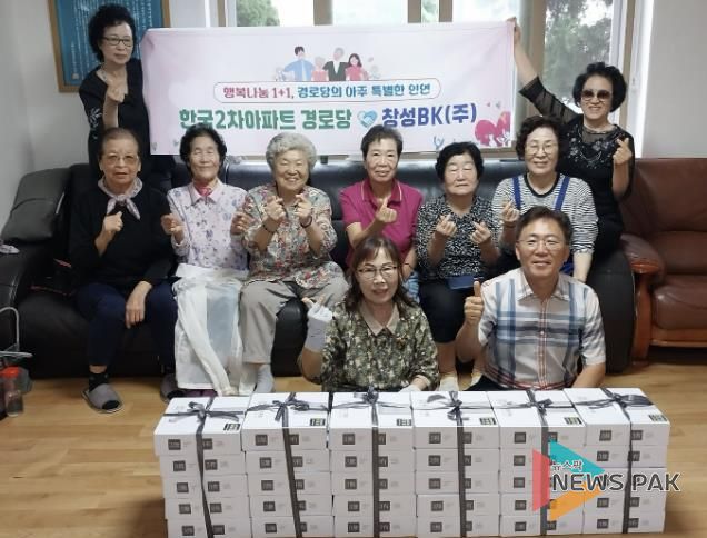 뉴스팍 배상미 기자 | 수원시 영통구 매탄4동에 소재한 ㈜창성BK, ㈜밀코 동수원서비스는 지난 19일과 22일에 각각 한국2차아파트 경로당과 매탄레이크파크아파트 경로당을 방문해 잔기지떡 30상자와 사과, 배 등 과일 4상자를 전달했다.