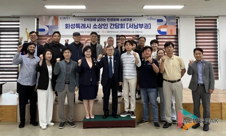 뉴스팍 류은정 기자 | 화성특례시가 22일 발안만세시장 고객지원센터에서 서남부권 소상인들의 현장 목소리를 청취하기 위한 ‘민생회복 소비쿠폰 소상인 간담회’를 개최했다.