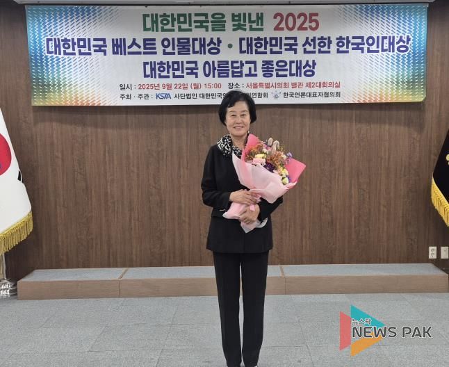 뉴스팍 배상미 기자 | 경기도의회 건설교통위원회 박명숙 의원(국민의힘, 양평1)이 22일 서울시의회 별관 2층에서 열린 ‘2025 대한민국 베스트 인물대상’에서 광역의정대상에 선정되는 영예를 안았다.