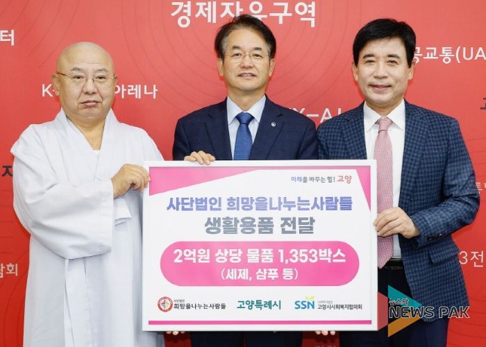 뉴스팍 배상미 기자 | 고양특례시는 23일 (사)희망을 나누는 사람들로부터 2억 원 상당의 생활용품 1,353박스를 전달받았다고 밝혔다.