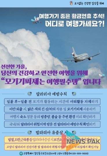 뉴스팍 배상미 기자 | 고양특례시 일산동구보건소는 긴 추석 황금연휴를 맞이해 가족들과 국내외 여행을 가는 시민들의 말라리아 예방수칙 준수를 당부했다.