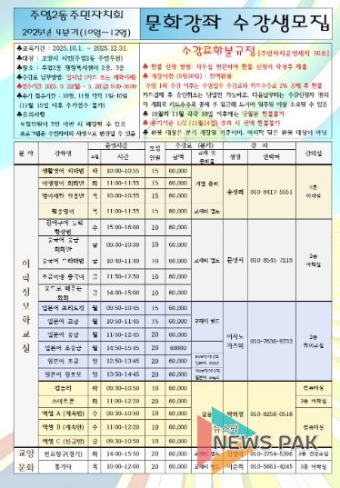 뉴스팍 배상미 기자 | 고양특례시 일산서구 주엽2동 주민자치센터는 오는 9월 26일까지 4분기 문화강좌 수강생을 모집한다고 밝혔다.