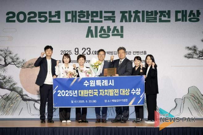 뉴스팍 배상미 기자 | 수원특례시가 (사)한국자치발전연구원 주관 ‘2025년 대한민국 자치발전대상’에서 기초자치 부문 대상을 받았다. 시상식은 23일 백범김구기념관 컨벤션홀에서 열렸다.
