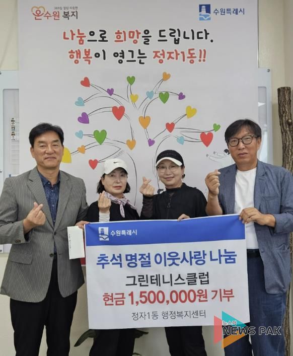 뉴스팍 배상미 기자 | 수원시 장안구 정자1동은 그린테니스클럽이 지난 23일, 추석 명절을 맞아 관내 취약계층을 돕기 위해 현금 150만 원을 기부했다고 밝혔다.