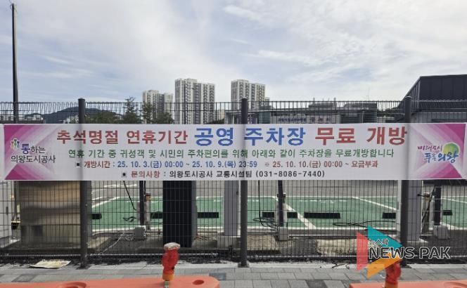 뉴스팍 배상미 기자 | 의왕도시공사는 시로부터 위수탁 받아 운영 중인 관내 공영주차장을 추석 명절 연휴 기간인 10월 3일(금) ~ 10월 9일(목)까지 7일간 무료 개방한다고 밝혔다.