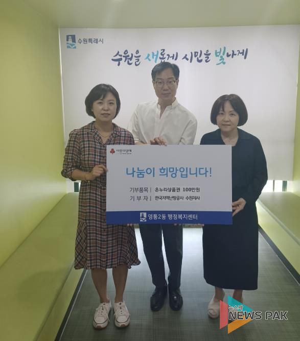 뉴스팍 배상미 기자 | 한국지역난방공사 수원지사는 지난 23일 추석 명절을 맞이하여 영통2동 관내 어려운 이웃들을 위해 온누리상품권 100만원을 영통2동 행정복지센터에 전달했다.