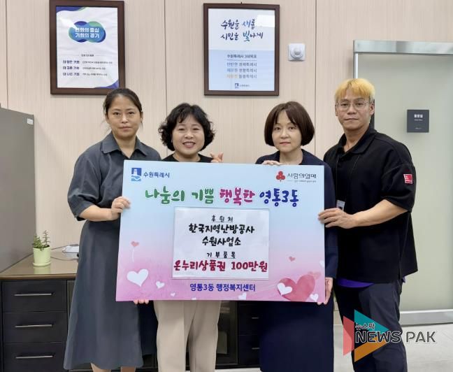 뉴스팍 배상미 기자 | 수원특례시 영통3동은 지난 20일, 영통3동 소재 한국지역난방공사 수원사업소으로부터 추석 명절을 맞이하여 온누리상품권 100만원을 기탁받았다고 밝혔다.
