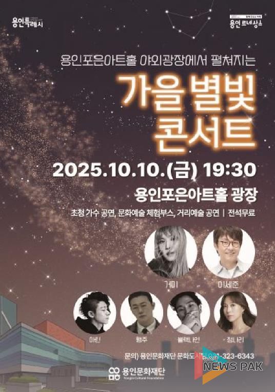 뉴스팍 배상미 기자 | 용인문화재단은 오는 10월 10일 오후 7시 30분, 새롭게 단장한 용인포은아트홀 야외광장에서 ‘가을 별빛 콘서트’를 개최한다. 이번 공연은 가을밤의 정취 속에서 시민들에게 특별한 추억을 선사하고, 용인의 대표 광장형 축제를 알리기 위해 마련됐다.