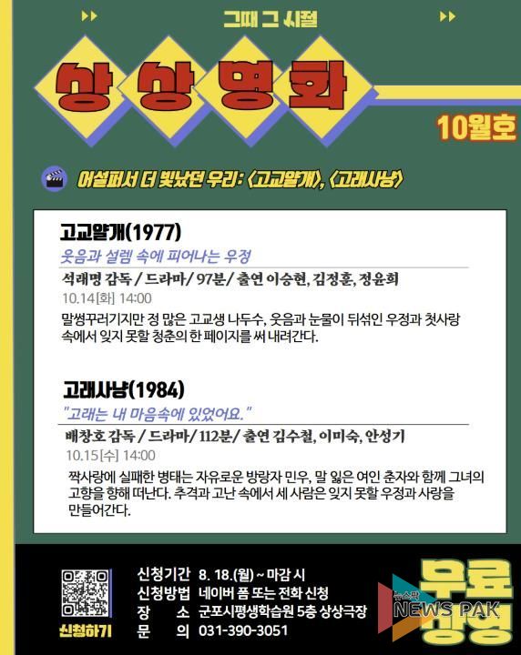뉴스팍 배상미 기자 | 군포문화재단 군포시평생학습원은 시민들의 문화 향유와 세대 공감을 위해 오는 10월 14일과 15일 상상극장에서 고전 영화 상영 프로그램 〈상상명화〉를 운영한다. 이번 상영작은 ‘고교얄개’와 ‘고래사냥’으로 무료 상영된다.