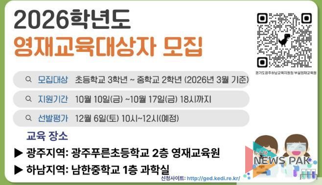 뉴스팍 류은정 기자 | 경기도광주하남교육지원청이 2026학년도 부설영재교육원 영재교육대상자 선발을 시작한다. 지원서 접수는 10월 10일부터 진행되며, 대상은 접수일 기준 광주·하남 지역의 초등학교 2학년부터 중학교 1학년까지다.