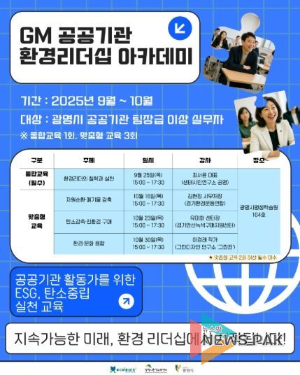 광명시환경교육센터는 오는 25일부터 10월 30일까지 ‘2025 GM(지엠) 공공기관 환경리더십 아카데미’를 운영한다.