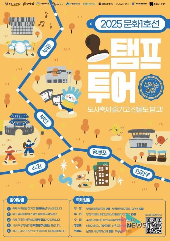 뉴스팍 배상미 기자 | 수원문화재단은 수도권 1호선 라인을 따라 펼쳐지는 특별한 문화여행,‘문화 1호선 스탬프 투어’를 오는 9월부터 11월까지 부평, 부천, 영등포, 수원, 의정부 5개 법정문화도시 축제 현장에서 운영한다고 밝혔다.