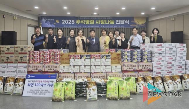뉴스팍 배상미 기자 | 수원시 팔달구 화서1동 행정복지센터는 지난 24일, 추석 명절을 맞아 지역사회 이웃들에게 따뜻한 사랑을 전하는 '추석 명절 사랑 나눔 전달식'을 진행했다. 이번 행사에는 다양한 후원자들이 참여해 어려운 이웃들과 함께 나누는 뜻깊은 시간을 만들었다.