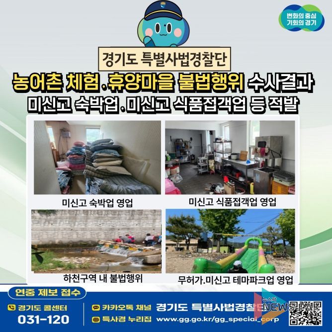 경기도특별사법경찰단은 농어촌 체험․휴양마을에서 발생하는 불법행위를 차단하고 안전사고를 예방하기 위해 수사를 진행했다고 설명했다.