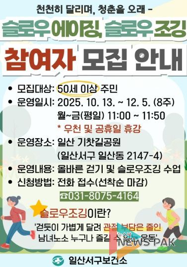 뉴스팍 배상미 기자 | 고양특례시 일산서구보건소는 10월 13일부터 12월 5일까지(8주간) 진행되는 ‘슬로우에이징·슬로우조깅’ 프로그램 참여자를 모집한다고 밝혔다.