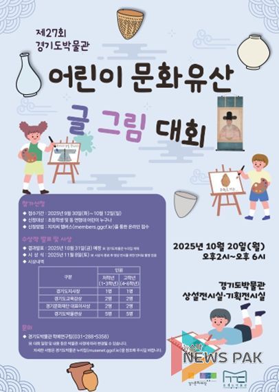 뉴스팍 배상미 기자 | 경기문화재단 경기도박물관은 오는 10월 20일, 〈제27회 경기도박물관 어린이 문화유산 글그림 대회〉를 개최한다. 올해로 스물일곱 번째를 맞이하는 이번 대회는 어린이들이 경기도박물관 전시실에 모여 전시 중인 문화유산을 직접 살펴보고, 이를 바탕으로 그림과 글로 창의력을 발휘하는 자리이다.