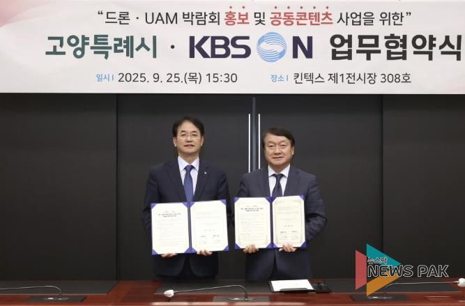 뉴스팍 배상미 기자 | 고양특례시는 지난 25일 고양 킨텍스에서 KBS N과‘드론·도심항공모빌리티(UAM) 박람회 홍보 및 공동 콘텐츠 사업을 위한 업무협약(MOU)’을 체결했다고 밝혔다.