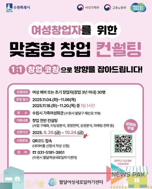 1대1 맞춤형 창업컨설팅은 11월 4~6일, 11월 18~20일 팔달여성새로일하기센터에서 진행된다. 전문 컨설턴트가 ▲창업 단계별 문제 진단 ▲사업 모델 구체화 ▲자금조달·정부지원사업 활용 ▲마케팅 전략 등 창업 전반에 대한 맞춤형 1대1 상담을 제공한다.