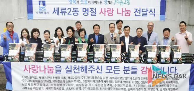 뉴스팍 배상미 기자 | 수원시 권선구 세류2동 행정복지센터는 지난 25일, 추석 명절을 맞이하여 관내 취약 계층에게 나눔을 통한 사랑을 전하기 위해 “추석명절 이웃사랑 나눔” 전달식을 개최했다.