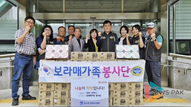 뉴스팍 배상미 기자 | 공군전우회 봉사단체 보라매가족 봉사단은 지난 24일, 추석명절을 맞아 권선2동 취약계층을 위해 라면 50박스를 기탁했다.