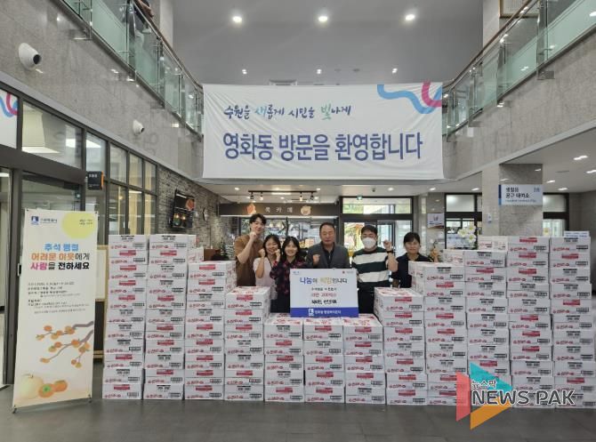 뉴스팍 배상미 기자 | 수원시 장안구 영화동에 위치한 북회원과 한샘마트가 지난 25일, 추석 명절을 앞두고 영화동 행정복지센터에 라면 200박스를 기부했다.