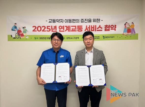 뉴스팍 배상미 기자 | 용인도시공사는 9월 25일 교통약자의 이동권 보장 및 이동지원서비스 고객 만족 향상을 위해 지티엑스에이운영(주)와 특별교통수단 철도 연계서비스 업무 협약을 체결했다고 밝혔다.