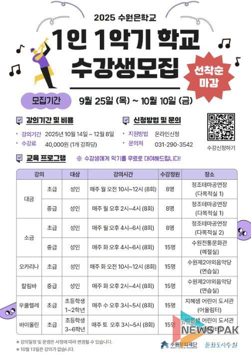 뉴스팍 배상미 기자 | 수원문화재단은 남녀노소 누구나 악기를 배우고 즐길 수 있는 ‘수원은학교 '1인 1악기 학교'’의 수강생을 10월 10일까지 선착순으로 모집한다.