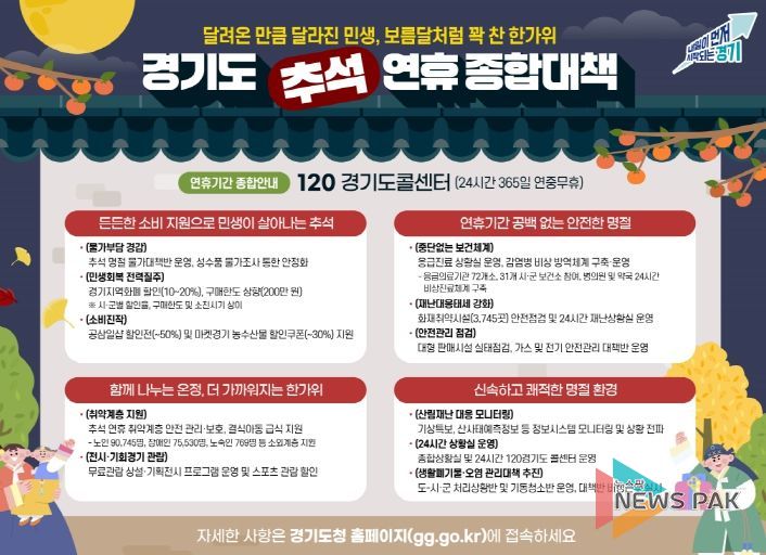 뉴스팍 배상미 기자 | 경기도는 도민 모두가 안전하고 넉넉한 추석을 보낼 수 있도록 10월 3일부터 10월 9일까지 7일간 ‘추석 연휴 종합대책’을 추진한다. 도는 종합상황실을 24시간 운영하고 비상근무 체계를 가동해 연휴 중 발생할 수 있는 불편과 사고에 신속 대응할 방침이다.