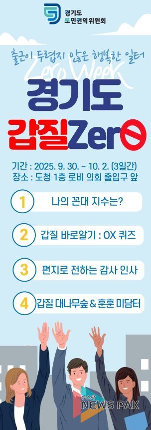뉴스팍 배상미 기자 | 경기도 도민권익위원회는 9월 29일부터 10월 2일까지 ‘경기도 갑질 제로(Zero) 홍보주간’을 지정해 갑질 근절과 건강한 직장문화 조성을 위한 다양한 캠페인과 교육 프로그램을 추진한다.