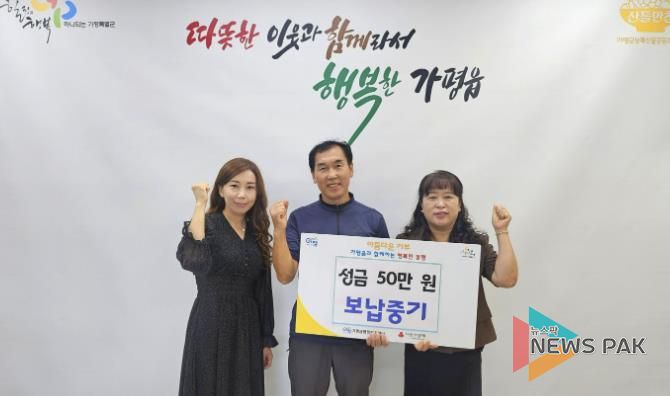 뉴스팍 배상미 기자 | 가평군 가평읍은 최근 보납중기에서 지역의 어려운 이웃을 위해 성금 50만 원을 기탁했다고 밝혔다.
