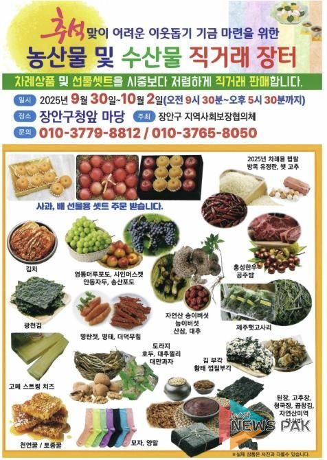 뉴스팍 배상미 기자 | 수원시 장안구 지역사회보장협의체는 민족 최대의 명절 추석을 맞아 오는 9월 30일부터 10월 2일까지 3일간 장안구청 앞 광장에서 ‘추석맞이 농수산물 직거래장터’를 개최한다.