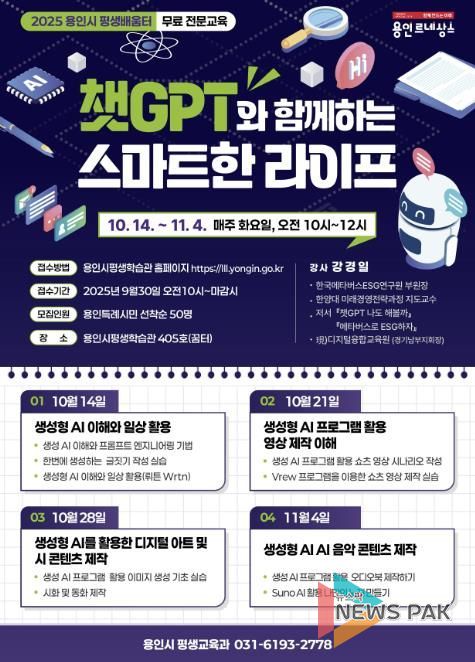 뉴스팍 배상미 기자 | 용인특례시는 시민들이 생성형 AI를 이해하고 실생활과 업무에 활용할 수 있도록 ‘챗GPT와 함께하는 스마트한 라이프’ 특강을 마련했다고 28일 밝혔다.