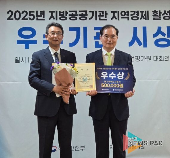 뉴스팍 배상미 기자 | 경기주택도시공사는(GH)는 서울 서초구 지방공기업평가원에서 열린 ‘2025년 지방공공기관 지역경제 활성화 우수사례’ 시상식에서 하남교산지구 수열·태양광 활용 ‘에너지비용 제로 아파트’ 시범사업으로 ‘사회적 가치 실현’ 분야 우수상을 수상했다고 29일 밝혔다.
