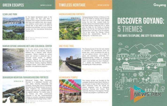 새로 발간된 관광홍보 안내지 제목은 ‘DISCOVER GOYANG: 5 THEMES’ 으로 자연·생태(Green Escapes), 역사·문화(Timeless Heritage) 등 5개의 테마로 분류해 관광지를 소개한다. 특히 방문객의 관심사와 취향에 맞춰 맞춤형 여행코스를 선택할 수 있도록 구성된 것이 특징이다.