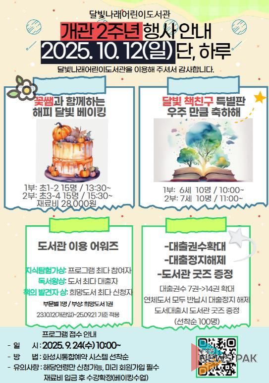 이번 2주년 기념행사는 오는 10월 12일에 열리며 ▲축하케이크 만들기 ▲책놀이 프로그램을 비롯해, 당일 방문자에게는 ▲기념품 증정 ▲도서 재기증 행사 ▲대출 권수 확대(7권→14권) 등 다양한 참여 이벤트도 함께 운영될 예정이다. 이에 더해 지난 2년간의 이용 실적을 바탕으로 선정한 우수이용자를 시상을 통해 감사의 마음도 전할 계획이다.