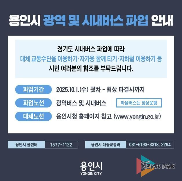 뉴스팍 배상미 기자 | 용인특례시는 경기도버스노동조합협의회가 10월 1일부터 임금 협상 타결 전까지 운행을 전면 중단하겠다고 예고함에 따라 시민 불편을 최소화하기 위해 전세버스 30대를 투입하는 등 비상수송대책을 마련했다고 30일 밝혔다.