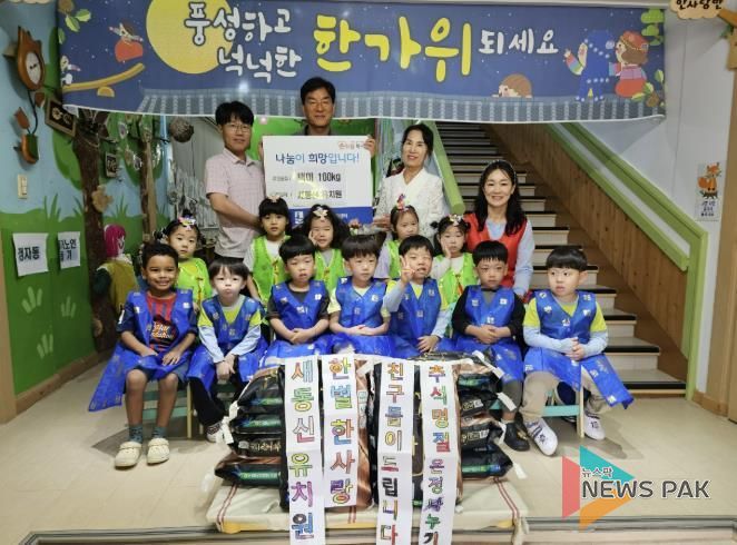 뉴스팍 배상미 기자 | 수원시 장안구 정자동에 위치한 새동신유치원은 지난 29일, 추석을 맞아 유아들과 함께 진행한 ‘시장 놀이 체험’에서 발생한 수익금으로 쌀 10포(각 10kg)를 구입해 정자1동 행정복지센터에 전달했다.