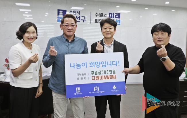 뉴스팍 배상미 기자 | 수원시 권선구는 지난 29일, 관내 기업 다원에서 후원금 오백만원을 기탁했다고 밝혔다.