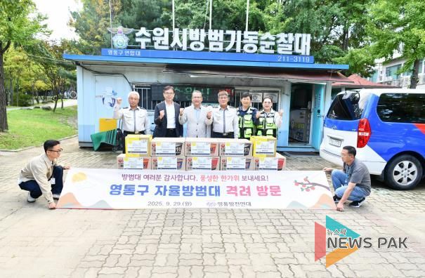뉴스팍 배상미 기자 | 지난 29일, 수원시 영통구 영통발전연대는 다가오는 추석 명절을 맞아 영통구 자율방범대 초소를 방문하여 격려 물품을 전달했다.